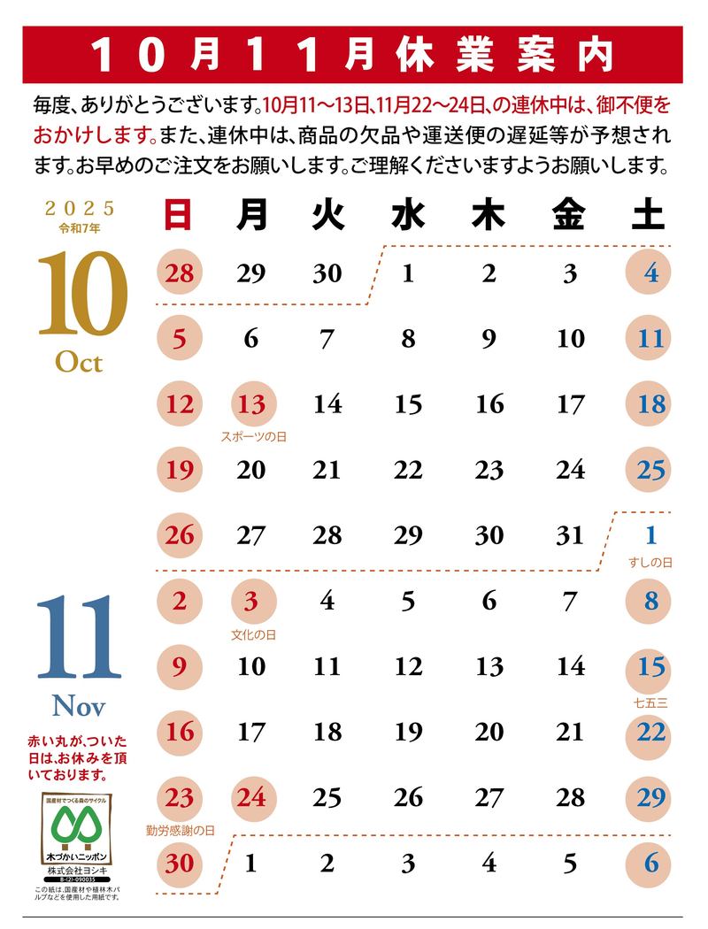 休業案内 10月11月