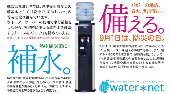 株式会社ヨシキでは、熱中症対策や災害備蓄水として、